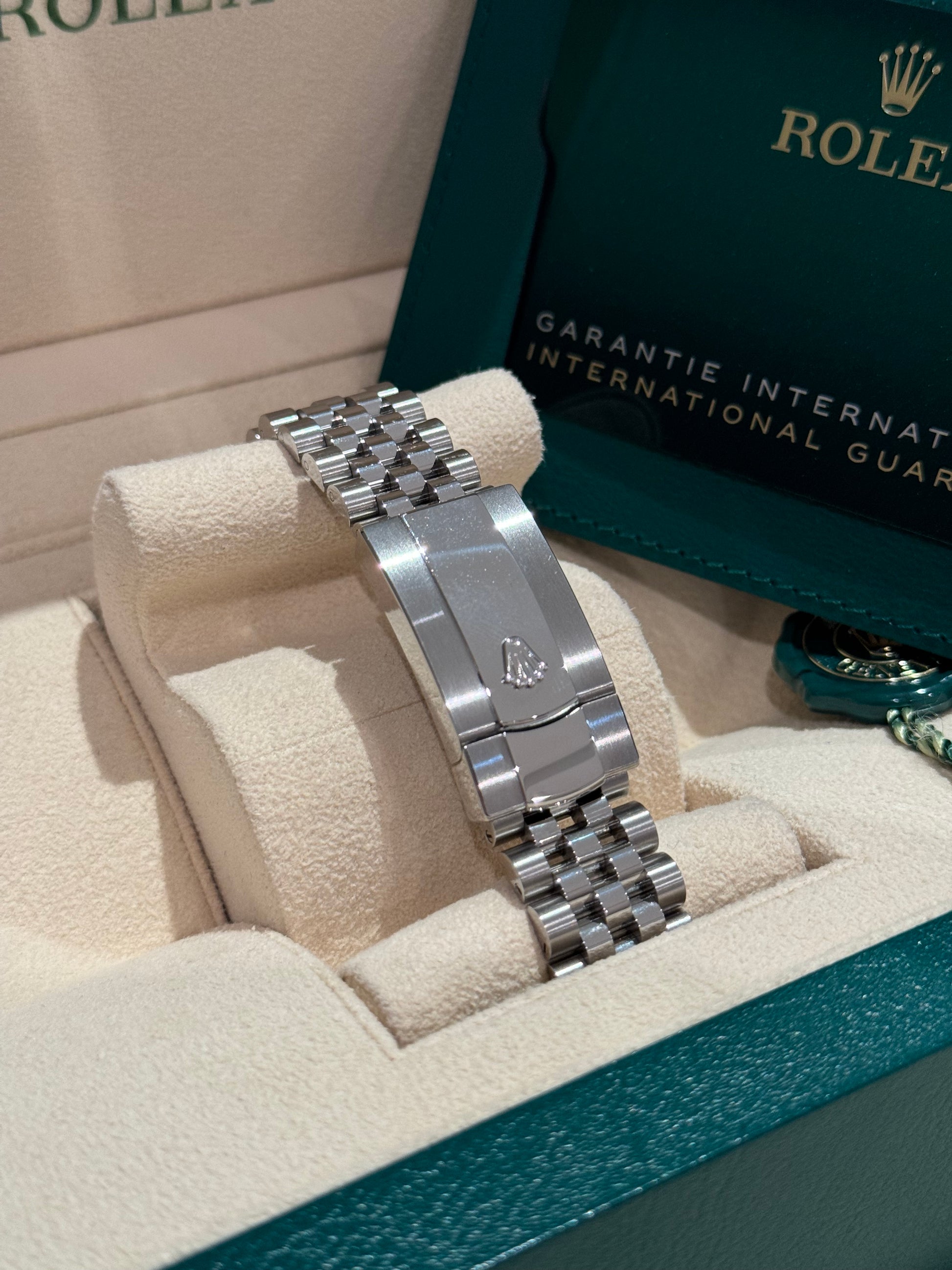 A refined and modern 2025 Rolex Datejust 41 featuring the sleek silver sunburst dial paired with an 18ct white-gold fluted bezel. The Jubilee bracelet enhances its classic elegance, making this one of the most versatile and desirable configurations in the Datejust lineup.